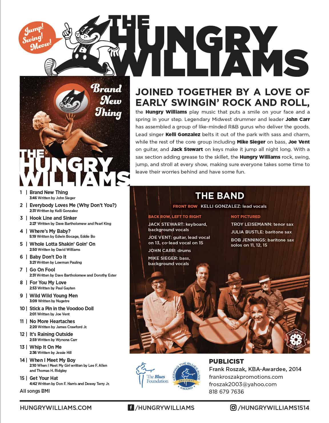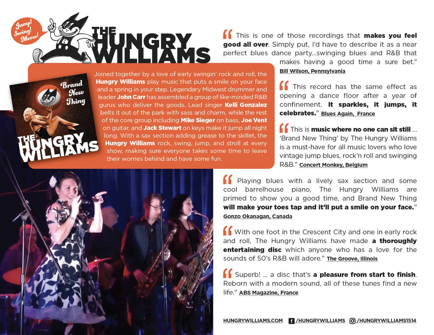 "This is music where no one can sit still … ‘Brand New Thing’ by The Hungry Williams is a must-have for all music lovers who love vintage jump blues, rock’n roll and swinging R&B.” – Concert Monkey, Belgium